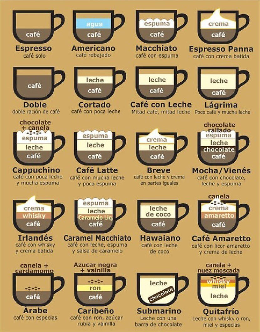 Cappuchino. Café con poca leche y mucha espuma. Se pueden agregar esencias como vainilla, amaretto o rompope. Se corona con topping de canela o chocolate.
